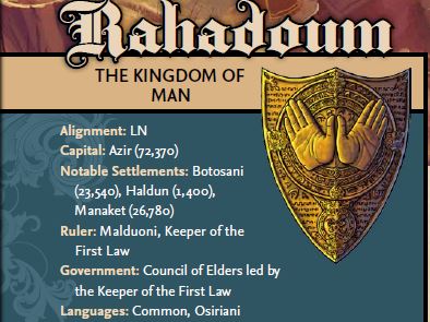 Il y a deux mille ans, province du grand empire d'Osirion, Rahadoum est aujourd'hui un vaste pays de Golarion principalement désertique mais au sein duquel on retrouve un large panel de biomes. C'est cette diversité qui a fait sa richesse, principalement grâce au commerce mais aussi grâce à la connaissance qui en émane. Les intellectuels viennent des quatre coins du continent pour consulter ses astrologues et ses bibliothèques.